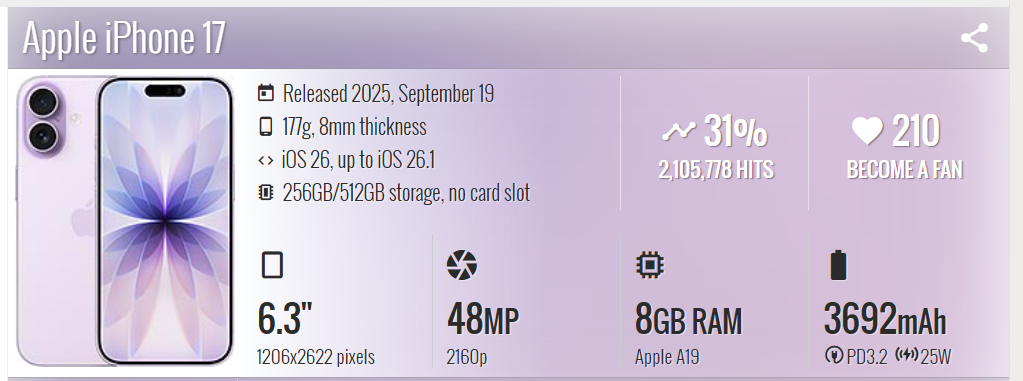 شرکت اپل هر ساله با معرفی نسل جدید آیفونهای خود، استانداردهای تازهای در طراحی، سخت افزار و نرم افزار تعریف میکند. امسال نیز iPhone 17 به عنوان ادامه دهنده مسیر سری محبوب آیفون با تغییرات مهمی در بخش نمایشگر، دوربین و پردازنده معرفی شده است تا ادامه دهنده مسیری باشد که ۱۸ سال پیش استیو جابز فقید آن را آغاز کرد. این گوشی با نمایشگرLTPO Super Retina XDR OLED، سیستم دوربین ۴۸ مگاپیکسلی دوگانه و تراشه A19 روانه بازار شده است. اپل در این نسل تمرکز ویژهای بر روی مقاومت و همچنین کارایی داشته است و قابلیتهایی مانند صفحه نمایش ۱۲۰ هرتزی و پوشش محافظ Cermic Shield 2 را در این گوشی قرار داده است.